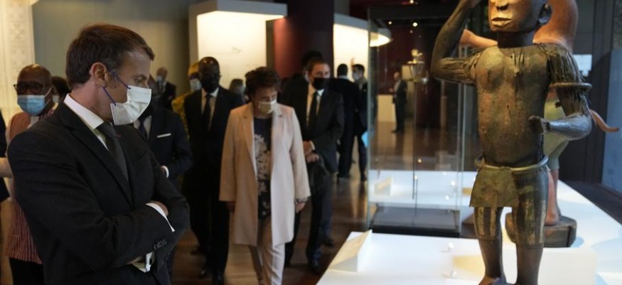 Cette cérémonie solennelle marque la dernière étape d'un processus inédit entamé avec la promesse faite en 2017 par Emmanuel Macron de procéder à des restitutions du patrimoine africain en France.